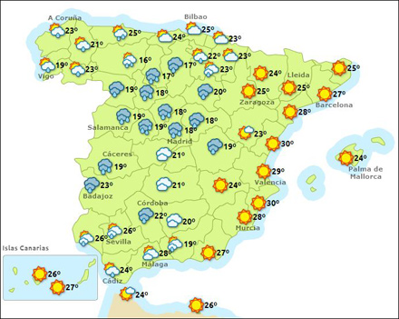I den sydlige del af Galicien, Castilla y León og den nordlige del af Extremadura kommer der vedvarende regn. Resten af landet får vekslende skydække og kun enkelte byger. Let skyet og en del sol i de østlige egne og på Balearerne.