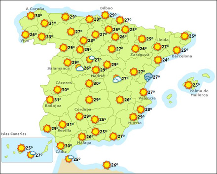 Madrid får i dag mellem 15 – 32 grader, Barcelona 17 – 27, Valencia 19 – 27, og Málaga 20 – 28 grader.