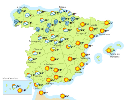 Barcelona får lidt skyer først på dagen, men ikke mange. De forsvinder midt på dagen, men de vender tilbage om aftenen. Dog uden at regne. Temperatuerne vil ligge på 18 til 24 grader.