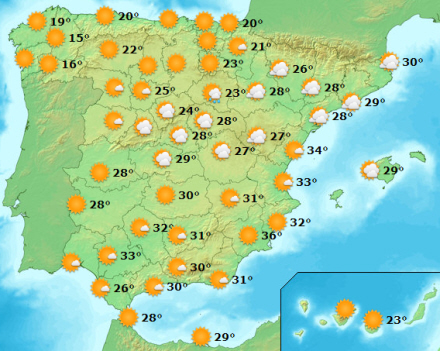 Madrid får i dag mellem 21 – 30 grader, Barcelona 23 – 30, Valencia 23 – 32 og Málaga 27 – 39 grader.