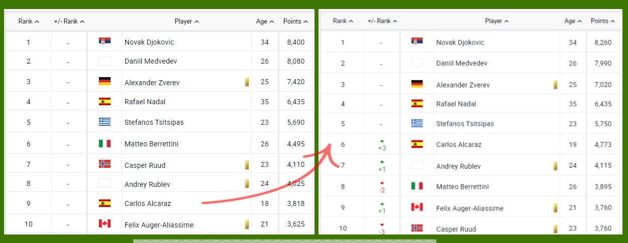 ATP-ranking søndag og mandag: fra nummer 9 til nummer 6. Klik i billedet for at se det større