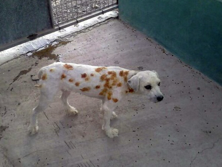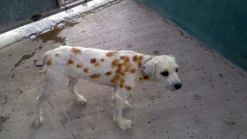 Hun ringede til politiet, som overførte hunden til det lokale dyreinternat, hvor den nu er ved at komme til hægterne igen. Som billedet ovenover afslører, blev hunden ramt af adskillige hagl. De orange pletter er jod, der er påført for at undgå infektion i skudsårene.