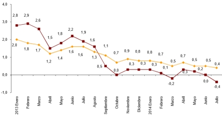 Priserne på forbrugsvarer faldt med 0,4 procent fra januar til juli, og det er mere end ventet, oplyser Spaniens Statistiske Institut.