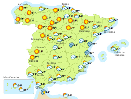 Dagtemperaturerne stiger svagt i den sydvestlige del af fastlandet, i det sydlige Galicien, Castilla y León og nordøst, mens der stort set ingen ændring er i resten af landet. Vinden vil være moderat i de nordøstlige og østlige kanarieøer somme tider afløst af stærk vind. Svag til moderat i den nordøstlige del ved den galiciske kyst, og svag vind fra øst ved Middelhavskysten.