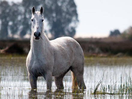 En hest køler sig i det forfriskende vand i naturreservatet 'Doñana'