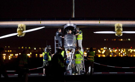 Sent tirsdag aften landede Solar Impulse planmæssigt i lufthavnen i Rabat. Her blev Piccard modtaget af sin partner på projektet, Andre Borschberg, samt lederen af det marokkanske solcelle-agentur, Mustafa Bakkoury.