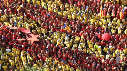 Catalanerne fejrede deres nationaldag i går med en kæmpe anlagt manifestation, hvor tusindvis af mennesker var på gaden, hvor de med stillede sig i røde og gule kolonner og dannede et 11 kilometer langt symbol i det catalanske flags farver.