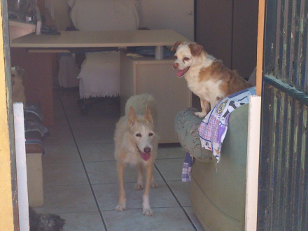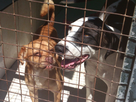 De fleste af hundene bor to og to i fine store kenneler. Det er dem der bor der midlertidigt. Der er et par hunde, som bor på stedet permanent, som går frit rundt.