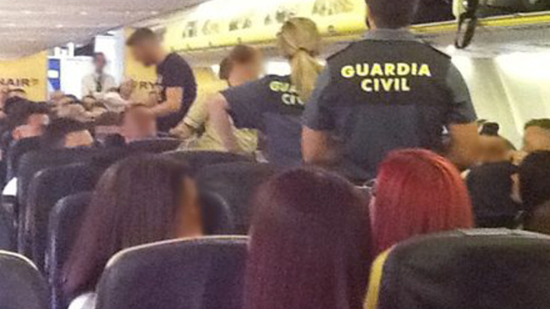 På Ibiza stod Guardia Civíl klar til at tage en alvorssnak med de tørstige herrer, og de forlod flyet med 5 af dem i håndjern, skriver thedailyrecord.co.uk