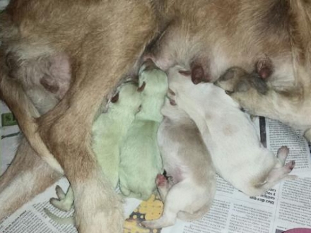 De to spanske hvalpe er dog ikke de første eksempler på grønne hundehvalpe. I 2012 skrev den britiske avis Daily Mail om en grøn Labrador-hvalp, der var født i England. Hvalpen mistede dog sin grønne farve ti dage efter fødslen.