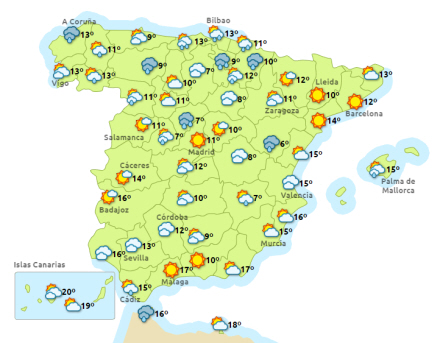 Dagtemperaturerne stiger let i den sydøstlige del af fastlandet, Castilla y León og Extremadura. Til gengæld falder nattemperaturen i den sydlige halvdel, mens den stiger i Nordvestspanien. Få ændringer i resten af landet.