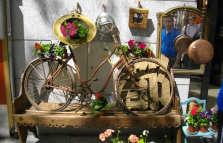 Var det noget med en gammel cykel parkeret på en bænk med blomster på?