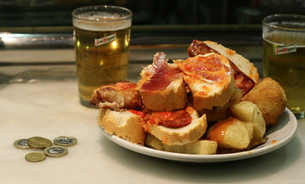 Med et glas sød cider (husets specialitet) kan du forvente at få en tallerken med tortilla (spansk kartoffelomelet), skinke eller albondigas (frikadeller).