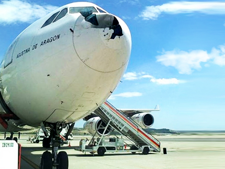 En Airbus A340 fra Iberia, som netop var lettet fra Barajas Lufthavnen i Madrid på vej mod Puerto Rico med 151 passagerer ombord, kolliderede i 2.000 meters højde med en kæmpegrib og blev tvunget til at nødlande.