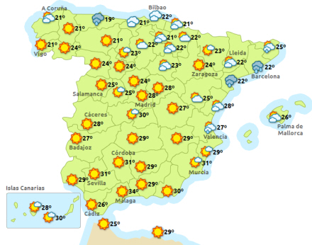 Madrid får i dag solrigt vejr og mellem 18 og 32 grader, mens det i Barcelona ser noget anderledes ud. Her er det overskyet, og der kommer byger - muligvis med torden. Mellem 21 og 25 grader. Valencia får letskyet vejr og mellem 20 og 30 grader, hvor Málaga fortsat får solrigt vejr og mellem 21 og 37 grader.
