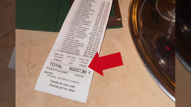 På denne regning udgjorde drikkepengene således 5.748,90 euro, angivet nederst på kvitteringen som "valgfri" - men med små bogstaver.