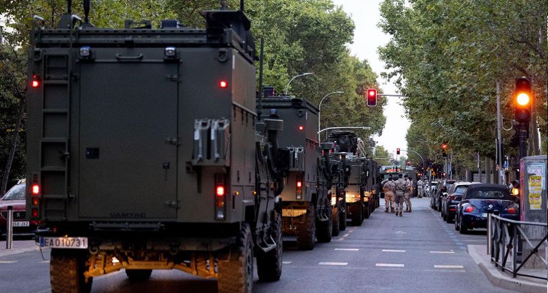 Herefter åbnede Den Kongelige Gardes motorcykelafdeling den jordbaserede parade, efterfulgt af jordenheder fra Hæren, Marinen og Luftvåbnet, samt personel fra Guardia Civil, Den Militære Nødstedsenhed (UME), Den Kongelige Garde, statens sikkerhedsstyrker og -korps og forskellige sikkerhedsorganer, Civilt Beskyttelse og Nødstilfælde. I alt 123 køretøjer, 39 motorcykler, 229 heste og seks hunde.