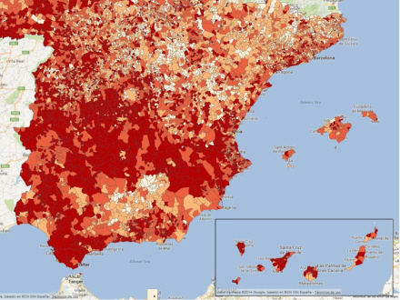 Når det gælder arbejdsløsheden fordelt på kommuner, viser opgørelsen for januar 2014 en mørkerød plet i centrum af Spanien, hvilket indikerer en ledighedsprocent på over 30 procent.
