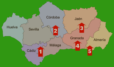 1: Grazalema, 2: Priego de Córdoba, 3: Cazorla, 4: Bubión og 5: Láujar