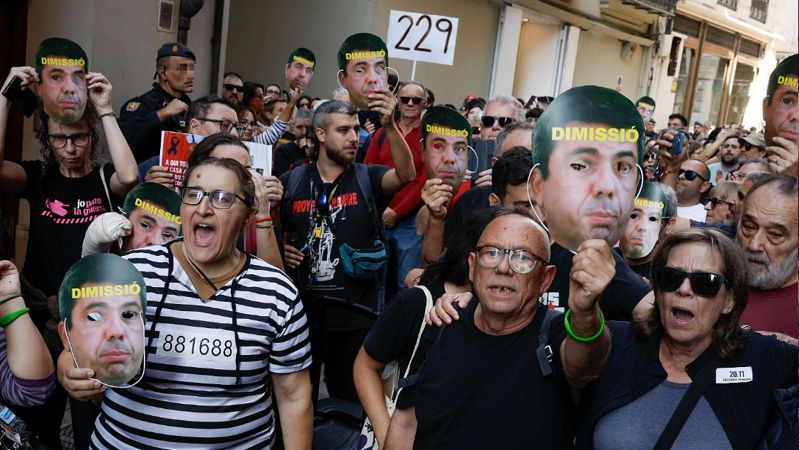 Hundredvis af mennesker mødte op i Valencia for at kræve afgangen af den valencianske præsident, Carlos Mazón, for hans kriminelle uagtsomhed i forbindelse med oversvømmelserne den 29. oktober. De lagde symbolsk 229 termiske tæpper på Pladsen foran Jomfruen (Plaza de la Virgen) over for Palau de la Generalitat til minde om de ofre, som flodboligen efterlod og hvis årsdag blev markeret onsdag.