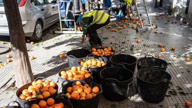 Indsamlingen af appelsinerne har stået på i et par uger, hvor kommunale arbejdere har haft travlt med at samle frugterne, inden de falder af træerne.