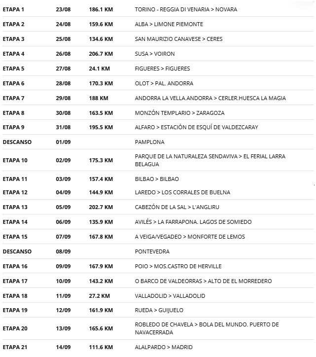 To korte enkeltstarter, som ikke er afgørende, men som kan skabe forskelle, og masser af bjerge. De 21 etaper over 23 dage - med to hviledage - akkumulerer i alt 3.151 kilometer mellem Torino og Madrid. Blandt etaperne er 15 kategoriseret som medium bjerg eller bjerg, med ti af dem, der slutter på en top.