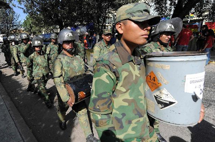 Bolivianske soldater bærer på tønder fyldte med tåregas