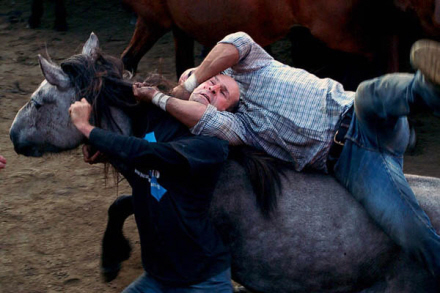 Modige mænd kæmper med hestene i arenaen i op til to timer. Det tager mange års erfaring at finde ud af, hvor man bedst overmander de vilde heste.
