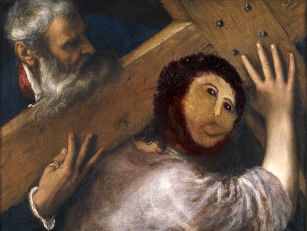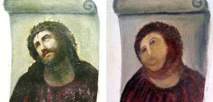 Vi taler om den meget omblæste og ret så mislykkede restaurering af det gamle Jesus-maleri ”Ecce Homo”, som i dag ligner en abe-mand og hurtigt fik navneforandring til "Ecce Mono".