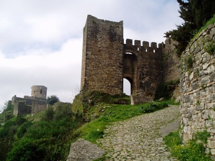 Vi fortsætter op mod borgen og går ind gennem den gamle port. Porten er bygget i arabisk stil, men borgen er faktisk grundlagt af fønikerne og senere overtaget af romerne. Dengang hed den Jimena Oba. Man har gjort fund af romerske mønter præget i Oba og på borgen findes der masser af sten med romerske inskriptioner. En af disse sten har araberne anvendt, da de byggede porten, så på portens venstre side kan man et stykke oppe se en stor sten med romersk skrift – stenen er vendt, så bogstaverne står på hovedet. Et pudsigt syn.