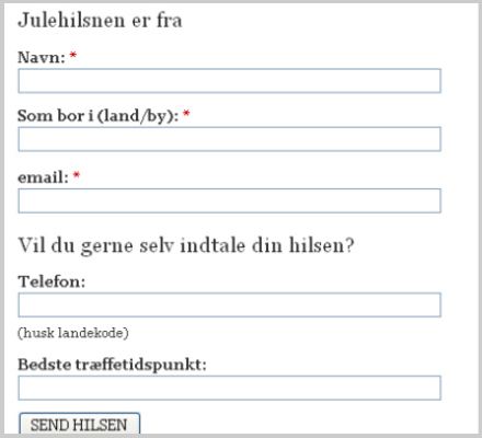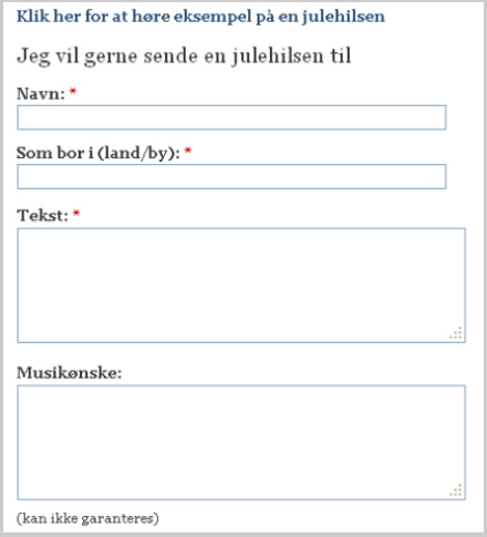 Men det er nu engang så hyggeligt at modtage dem, og derfor har vi her på redaktionen tænkt os at hjælpe alle til at få en skøn jul. Kvit og frit (fra leveren) kan du nemlig helt enkelt sende os en hilsen til dine kære, som vi vil bringe i vores store juleprogram i radioen den 24. december. Det er en ganske enkelt formular, du udfylder på vores hjemmeside, og så kan du i øvrigt selv vælge, om vi bare skal læse din hilsen op, eller om du vil indtale den selv. Begge dele er meget simpelt.