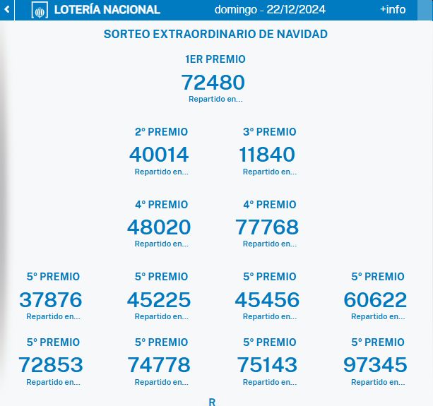 Af de otte femtepræmier, er de fleste af dem er blevet uddelt i hele Spanien, selvom der er tre numre, som udelukkende er blevet solgt i Madrid.