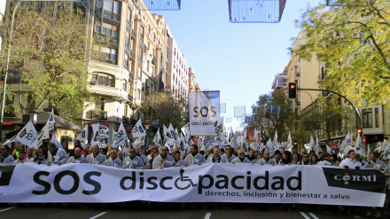 Flere tusinde handicappede og deres pårørende lammede søndag middag store dele af Madrid i protest mod regeringens nedskæringer og forringede vilkår for landets udsatte borgere.
