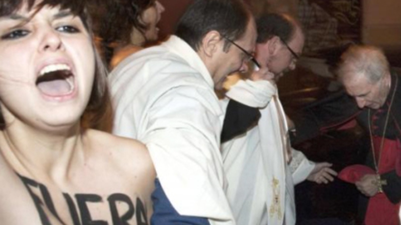 Fem topløse demonstranter slog ud mod ærkebiskop Antonio Maria Rouco Varela, da han steg ud af en bil for at deltage i søndagsmessen. Kvinderne havde overkroppen overmalet med slagord og kastede røde trusser mod ærkebiskoppen, der siges af være en af drivkræfterne bag den konservative regerings planlagte abortreform.