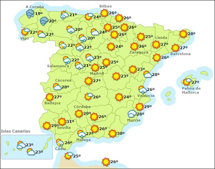 Madrid får i dag mellem 18 – 29 grader, Barcelona 18 – 30, Valencia 20 – 29 og Málaga 20 – 28.
