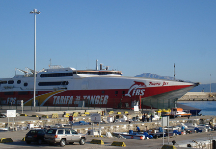 Færgen fra Tarifa til Tanger. På siden af færgen står 35 min.