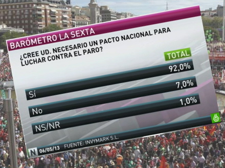 En måling foretaget af TV-stationen LaSexta viser, at 92 procent af indbyggerne kræver en bred aftale hen over den politiske midte, for at få en pagt om jobskabelse og social sikring. De politiske ledere snakker om pagter og brede aftaler, men det bliver kun ved snakken.