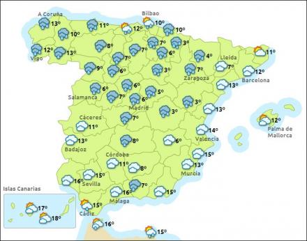 Der er snevarsel i Orense, Asturien, Cantabrien, Navarra, Huesca, Lérida, Cuenca, Guadalajara, Jaén, Madrid, León, Burgos, Palencia, Soria, Segovia og Zamora.
