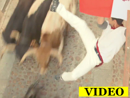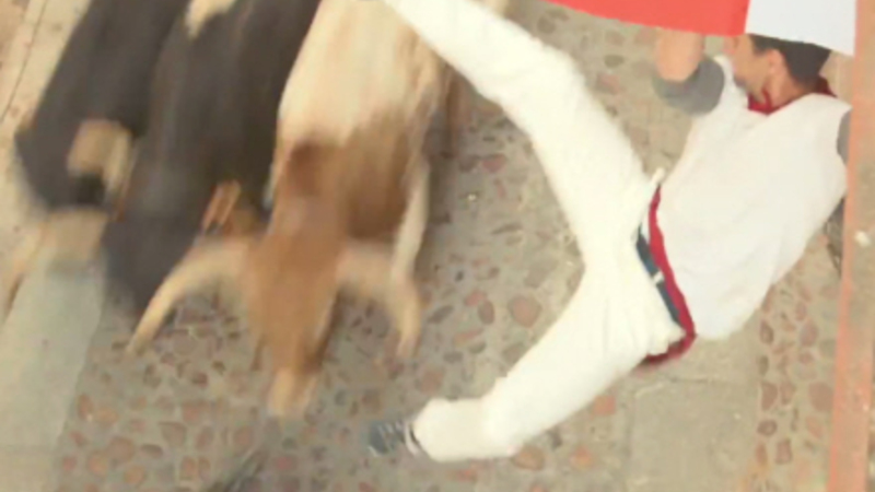 Det er ikke det kendte løb i Pamplona, men et løb arrangeret særligt til lejligheden med erfarne tyreløbere og stuntmænd som deltagere.