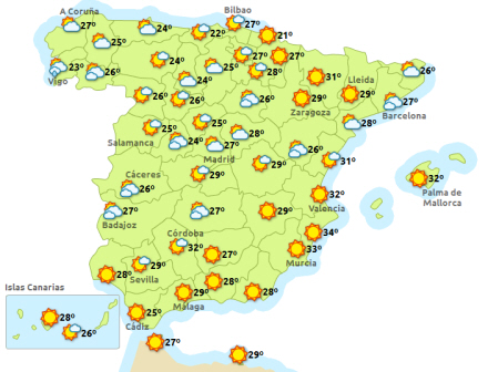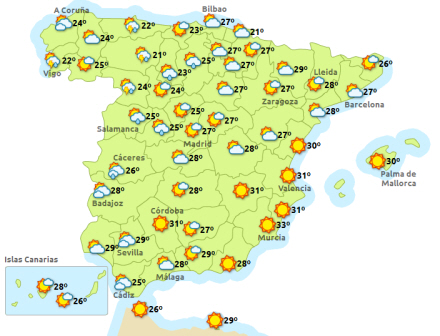 Madrid får i dag fortsat solrigt vejr med 17 til 30 grader, i Barcelona bliver det ret skyet med mulighed for byger, men efterhånden opklaring og 21 til 27 grader, Valencia, solrigt og 23 til 32, og Málaga ligeledes solrigt og 21 til 30 grader.
