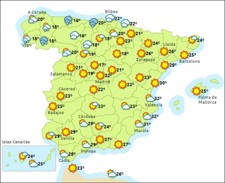 Madrid får i dag mellem 12 – 25 grader, Barcelona 17 – 26, Valencia 19 – 31 grader og Málaga 19 – 26 grader.