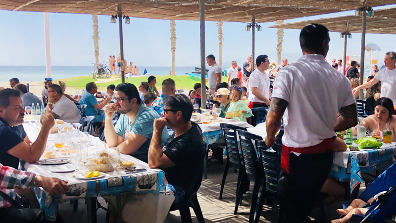 Efter besøget på gården kører vi til Málaga for at spise frokost på den berømte strandrestaurant El Tintero i El Palo. Undervejs kommer vi omkring, hvordan maden serveres ved at retterne råbes ud i lokalet: “Ansjoser, hvem vil have ansjoser….muslinger, hvem vil have muslinger og til sidst - naturligvis: Jeg tager mod betaling, hvem vil betale…”