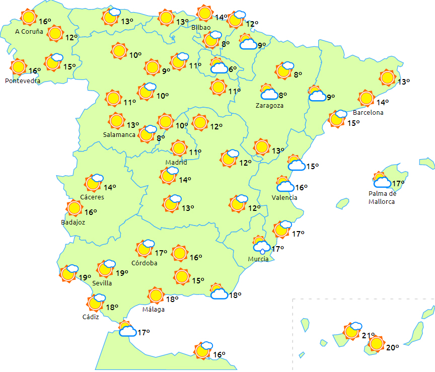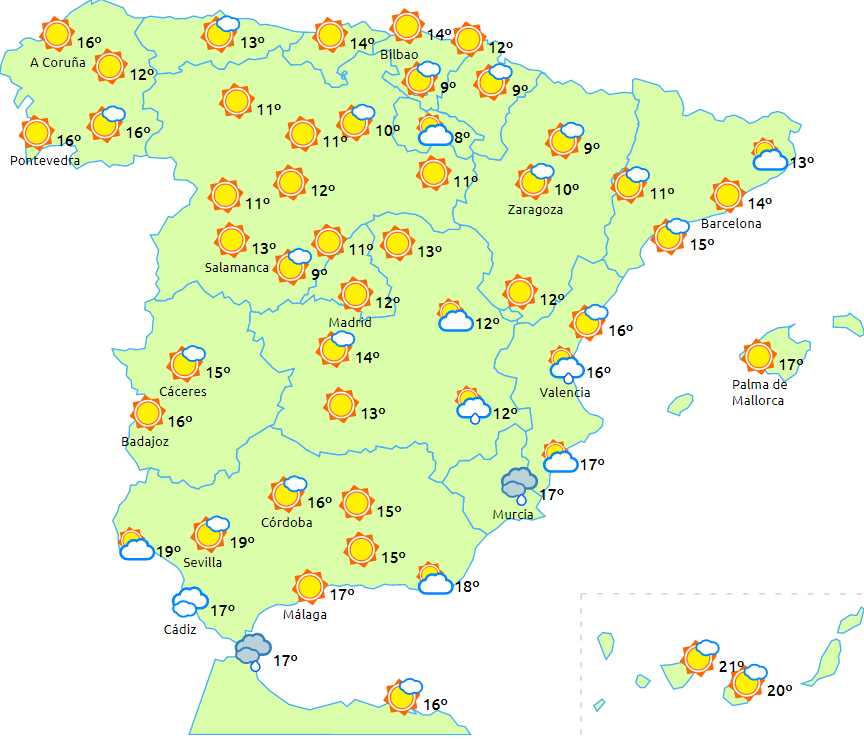 Dagstemperaturerne vil falde på det meste af halvøen. Nattemperaturer uden større ændringer med let frost i bjergene, de omkringliggende områder og hederne på den nordlige halvdel og i den sydøstlige del af fastlandet. Koldest i Pyrenæerne. Kun få ændringer på Balearerne og De Kanariske Øer.