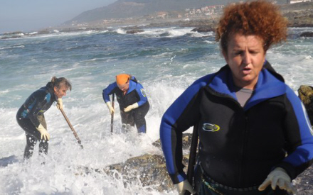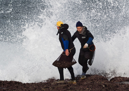 Hver gang en bølge trækker sig tilbage til havet, følger kvinderne hurtigt efter og bevæger sig erfarent til kanten af klippen, hvor hakker langhalsene fri med en metalstang.
