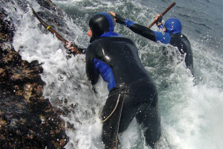 Men de skal være på dupperne og være klar til at løbe hurtigt tilbage fra bølgerne, der smadrer ubønhørligt ind mod klipperne igen og igen.
