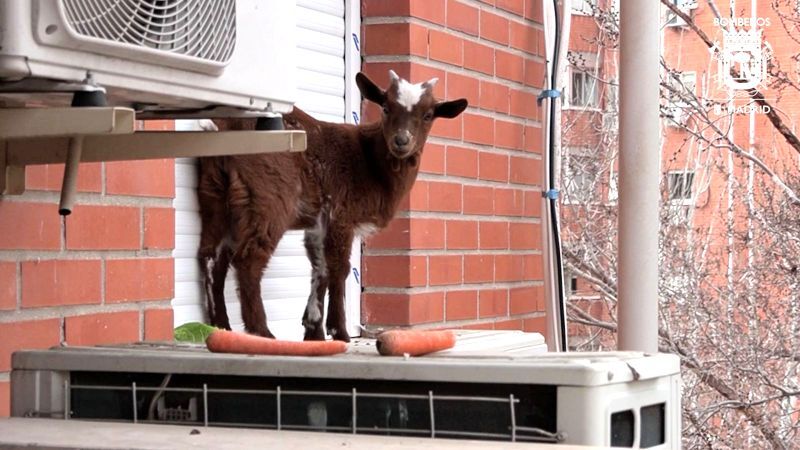 Brandfolkene placerer derfor et bræt for at nå aircondition-enheden og lokker geden med gulerødder, salat og vand. Det lykkedes dem at vinde gedens tillid og få den over brættet til nabolejlighedens terrasse.