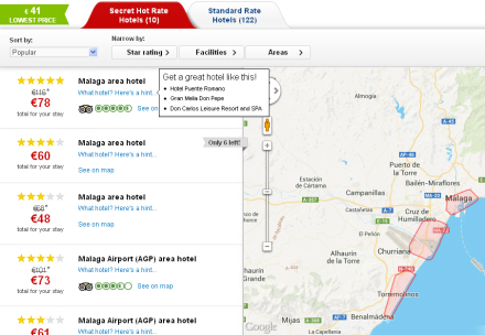 Hvis du eksempelvis søger på en overnatning i Málaga, kommer der en liste op med 14 hoteller. Her får du oplyst, hvor mange stjerner, hotellerne har, i hvilket område, pris og rabat. Blandt andet er der et femstjernet hotel i Torremolinos, hvor en overnatning fra den 1. til den 2. juli normalt koster 105 euro, men sælges nu til 65 euro.