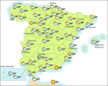 Madrid får i dag mellem 18 – 24 grader, Barcelona 22 – 26, Valencia 23 – 28 og Málaga 21 - 27.