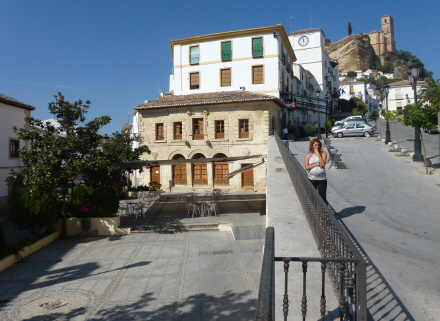 Nu skal vi op og bese borgen og kirken deroppe på toppen, så vi vandrer op ad Plaza de España og forbi byens rådhus, der ligger i et tidligere kloster. På vejen op passerer vi et sted med en masse små kapellignende huller, der er hugget ind i klippen. I Middelalderen blev de brugt som gravpladser.