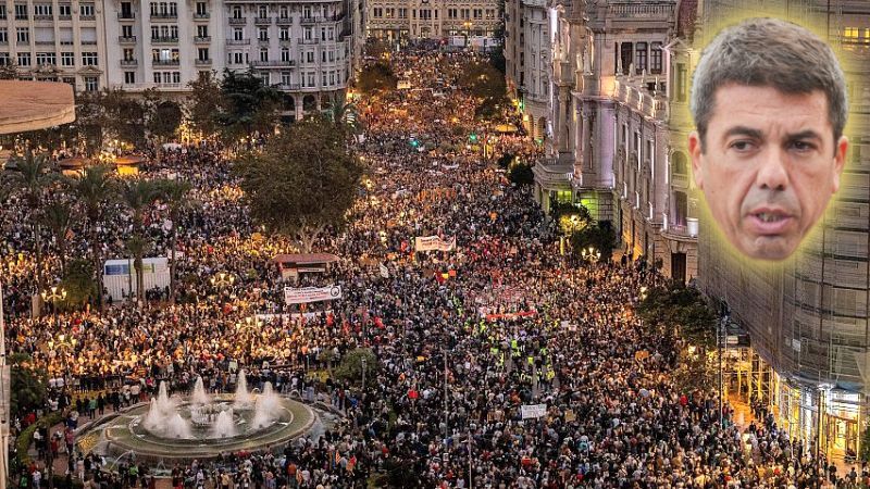 En massiv march i Valencia kræver Mazóns afgang, fordi han har overladt befolkningen til deres egen skæbne. Fire personer er blevet anholdt, og 31 politibetjente såret i optøjer ved demonstrationens start og slutning.